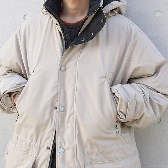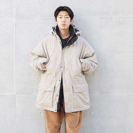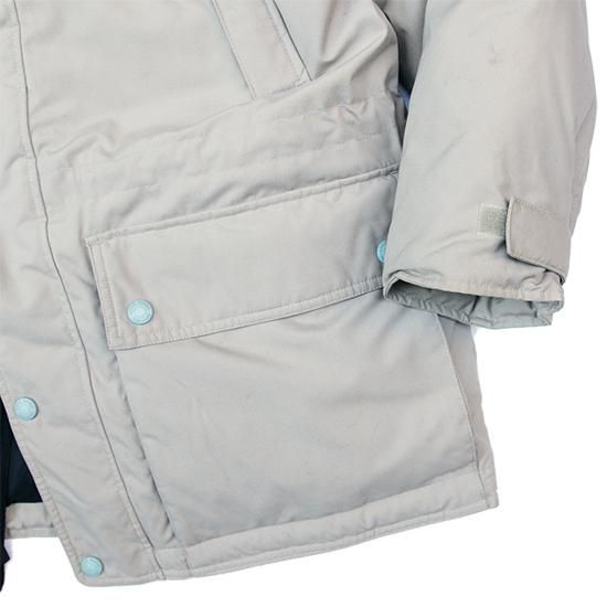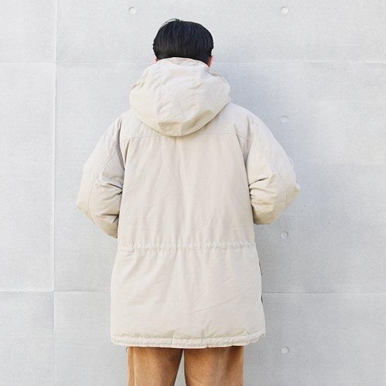 2000年代 エディーバウアー/グースダウンパーカ アメリカ軍やエベレスト登頂隊などでの納入/使用実績を持つエディーバウアーのダウンウェアは中綿にフェザーは使わず、ふかふかで軽く高い保温性を持つグースダウン100%。 厳しい寒さで知られる地元ワシントン州を中心に絶大な人気を持ち、細かな仕様変更を繰り返しながら長くリリースされ続けていたロングセラーモデル。 ポケットの形状や襟周り、袖付などリリース年によって細かくディテールが違うのもこのグースダウンパーカシリーズの特徴。 このモデルはシェルに防風、撥水性の高いポリコットンシェル、胸下フラップ付ハの字ジップポケット、首内側にリブ、袖先内側にリブカフ、フロントダブルジップ、フロントと内側合わせて11室のポケットを装備。 欠損しがちなフードも完備です。 表地:コットン65%xポリエステル35% 裏地:ナイロン 中綿:グースダウン 襟内側リブ、ウェスト・裾ドローコード、ダブルジップ、袖先内側リブカフ、袖先ベルクロアジャスター フロントフラップ裏にジップポケット、胸下ハの字ジップポケット、腰2口ポケット、内ポケットx4室 カラー:ストーン コンディション:ユーズド *右袖先に点シミと右腰ポケットフラップに薄ヨゴレあり 表記サイズ:M 胸囲 130cm/背丈 86cm/肩幅 55cm/袖丈 63cm 着用モデル身長:179cm その他のエディーバウアー/ダウンはこちらから