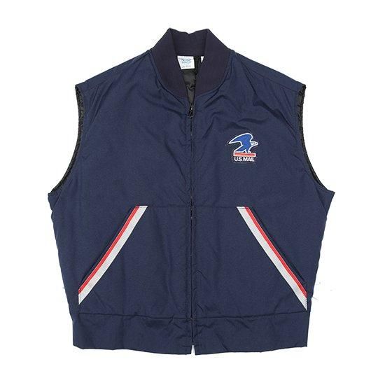 1980年代 USPS/レターキャリアワーキングベスト アメリカ製 USPS (Unirted States Postal Service)の中綿ナイロンワーキングベスト。 シェルは耐久性の高いコーデュラナイロンx中綿は軽く保温性の高いファイバーフィル。 おなじみの少し青みのあるネイビーに、レッドとシルバーのリフレクティブテープが配されています。 生産は多くのUSPSの制服を手がけるBrookfield社。 アメリカ製 表地:コーデュラナイロン100% 裏地:ナイロン100% 中綿:ポリエステル ファイバーフィル 腰ポケット カラー:ネイビー コンディション:ユーズド/特に目立つダメージ無し、グッドコンディション 表記サイズ:US 38-40/M 胸囲 118cm/背丈 59cm/肩幅 47cm 着用モデル身長:179cm その他のUSPSのアイテムはこちら