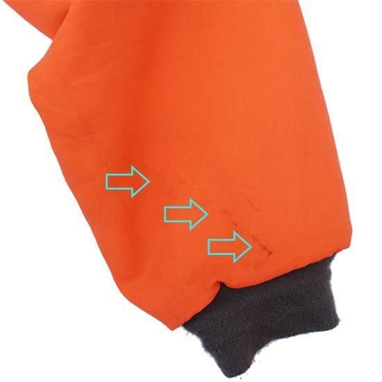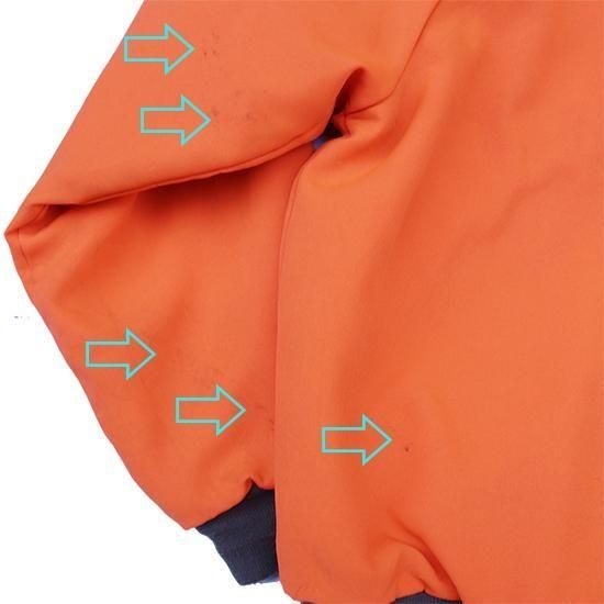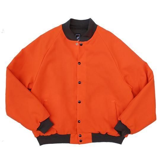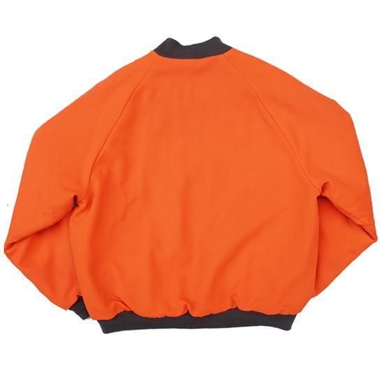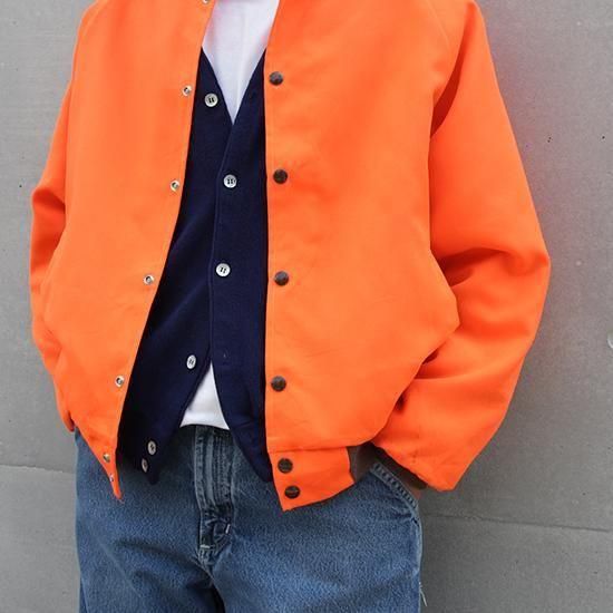 1980年代 レッドヘッド/キルトラインドフィールドジャケット アメリカ製 アメリカの老舗アウトドアスポーツメーカー"Red Head" 裏中綿キルティングのアワードジャケットスタイル。 ハンティング中に誤射を防ぐためのハンターオレンジが冴えた1枚。 ファッション用に作られたアイテムでは無いものをファッションとしてどう着こなすかが腕の見せどころであります。 表地:ポリエステルxコットン 裏地・中綿:ポリエステル ラグランスリーブ、腰2口ポケット、襟・袖先・裾リブ カラー:ハンターオレンジ コンディション:ユーズド *左袖先前、左袖後、背中左腰部分にヨゴレあり 表記サイズ:M 胸囲 124cm/背丈 63cm/裄丈 90cm 着用モデル身長:179cm その他のワークジャケットはこちらから