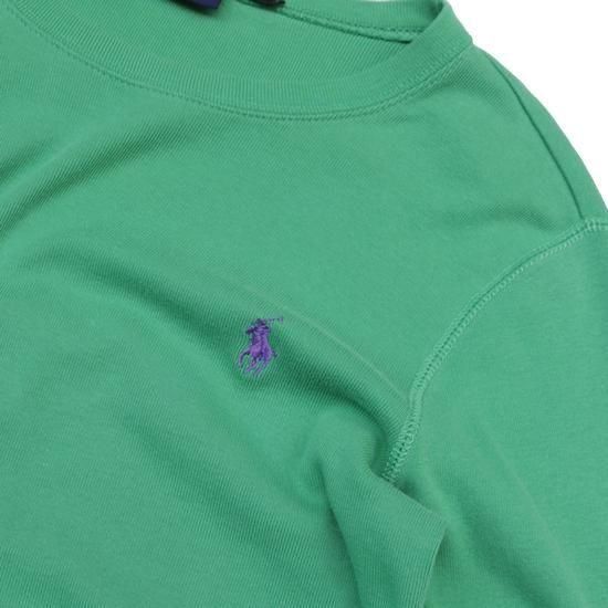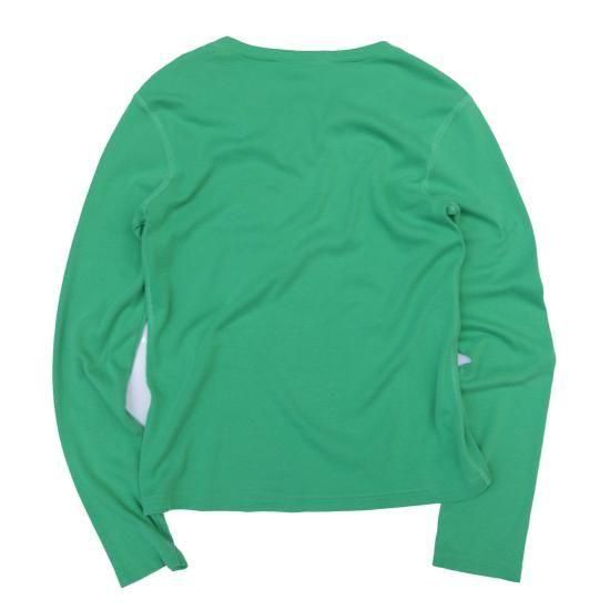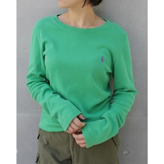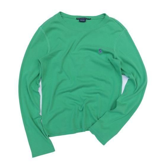 1990-00年代 ラルフローレンスポーツ/ポニーロゴロンT グリーンにパープルポニーがジョーカーの配色で最高、袖丈がやや長めですらっとして見える、助かる🙏✨ 素材:コットン100% カラー:グリーン コンディション:ユーズド *左肩甲骨付近一部薄く色抜けあり 表記サイズ:L (実寸 Women's S-Mサイズ) 胸囲 86cm/背丈 56cm/肩幅 39cm/袖丈 62cm 着用モデル身長:156cm <その他のシャツ、ブラウスはこちら> <コーディネートで使用したアイテム> *カナダ軍 カーゴパンツ