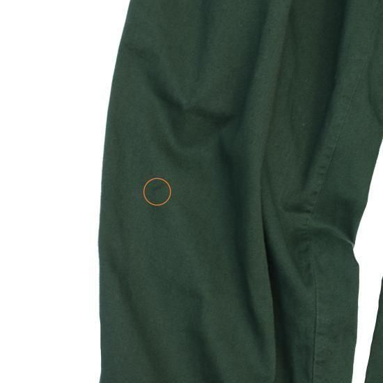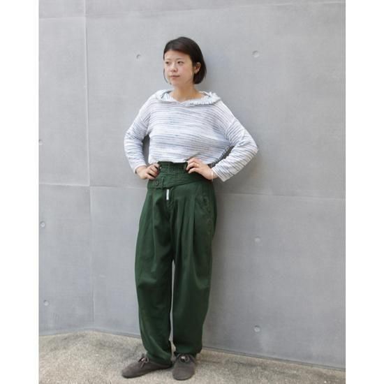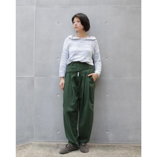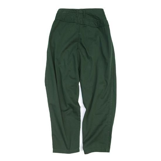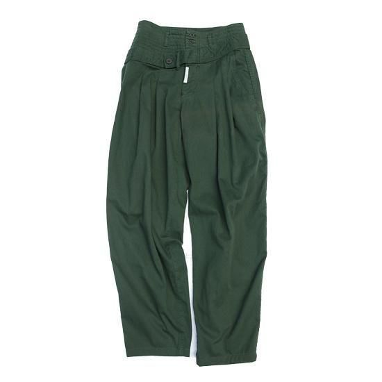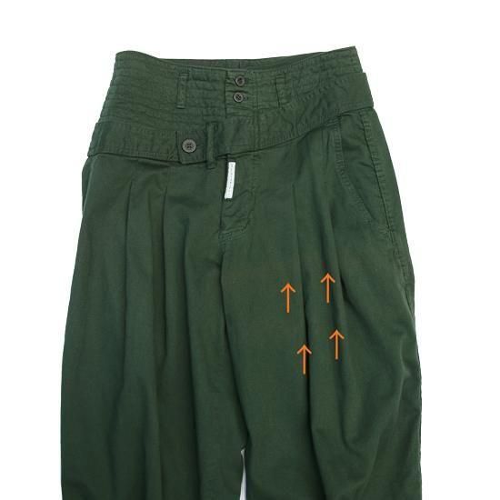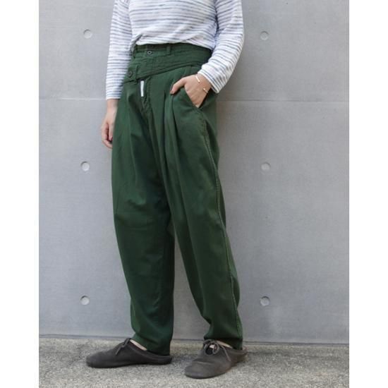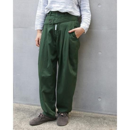 1990年代 ゼットカヴァリッチ/2タックデザインテーパードパンツ グルカパンツのような印象を受ける、ウエスト部分のデザインがユニークな一着。ハイウエストながらタックによって腰回りにゆとりをもちつつ、膝から裾にかけてテーパードがグッと効いたナイスシルエットです。 素材:コットンツイル アメリカ製 2タックフロント、ジップフライ 左腰にポケット カラー:ダークグリーン コンディション:ユーズド *左ももにやけ、右膝に小さなシミ 表記サイズ:29 実寸サイズ:W27xL28 ウエスト 68cm/股上 30.5cm/ワタリ 29cm/レングス 70cm/裾幅 17.5cm/総丈 100cm 着用モデル身長:156cm <その他のパンツ、ショーツ、オーバーオールはこちら> <コーディネートで使用したアイテム> *サマーニット