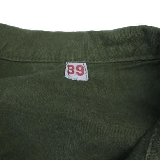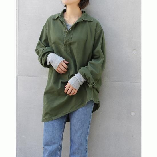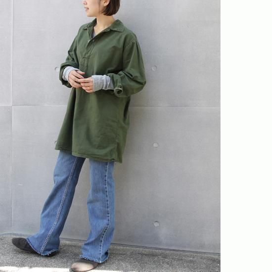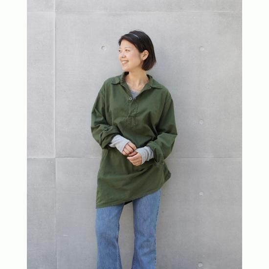 1970年代 スウェーデン軍/M-55プルオーバーシャツ スウェーデン軍のパジャマシャツ、M-55。このシンプルでモダンな雰囲気が好きなので私の秋冬の定番アイテムのひとつで、着丈が長いのでミニワンピ的な感じで着たり、ウエストマークしてみたり。特有の深いオリーブにこのうすーいボタンが好きなんですよね、スウェーデン軍。 素材:コットン カラー:オリーブ コンディション:ユーズド 表記サイズ:39 (Women's M-Lサイズ) 胸囲 116cm/背丈 81cm/肩幅 45cm/袖丈 61cm 着用モデル身長:156cm <その他のシャツ、ブラウスはこちら> <コーディネートで使用したアイテム> *リーバイス517 *ミラー L/S (新品インポート)