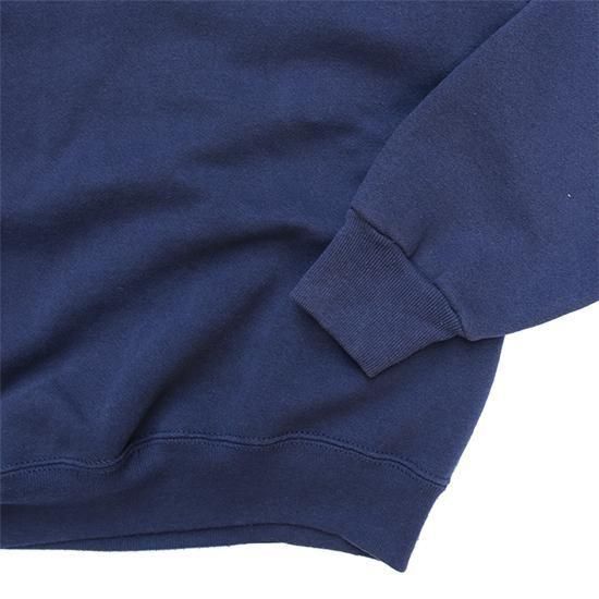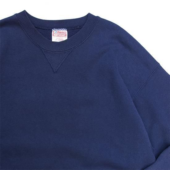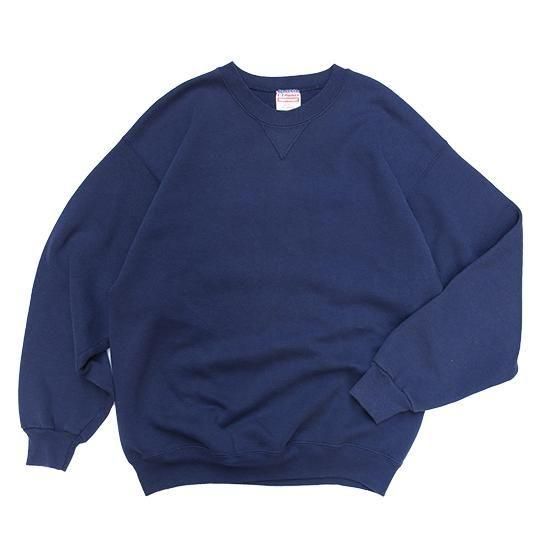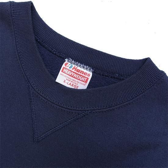 1990年代 ヘインズ/クルースウェット アメリカ製 最近お探しの方が多いちょい古のアメリカ製スウェット、 こちらはヘインズの90sアメリカ製オールドクルースウェット。 "Heavy Weight"の表記の通り、 コットン50xポリエステル50の厚手のスウェット地を採用。 古着らしく着こまれて表はドライに、 裏の起毛も良い感じに潰れ、着頃を迎えた1枚 素材:コットン50%xポリエステル50% カラー:ネイビー コンディション:ユーズド/特に目立つダメージ無し 表記サイズ:XL 胸囲 110cm/背丈 68cm/肩幅 55cm/袖丈 59cm 着用モデル身長:179cm その他のスウェットアイテムはこちらから