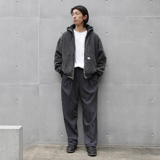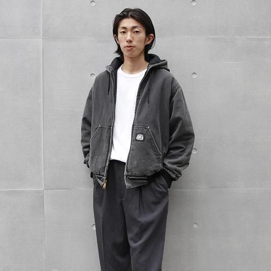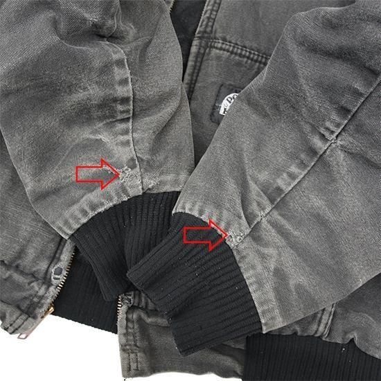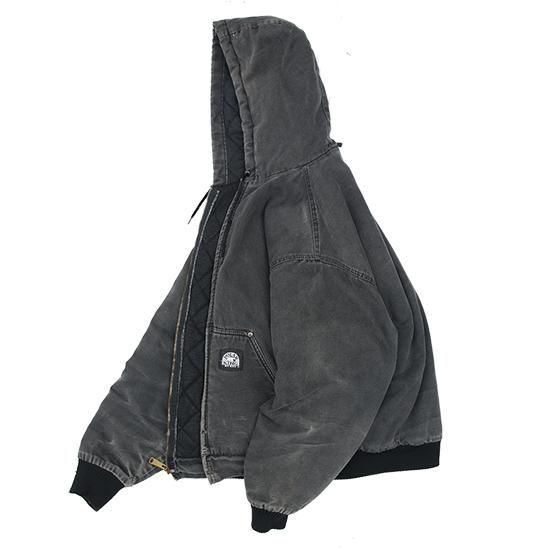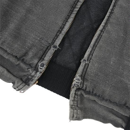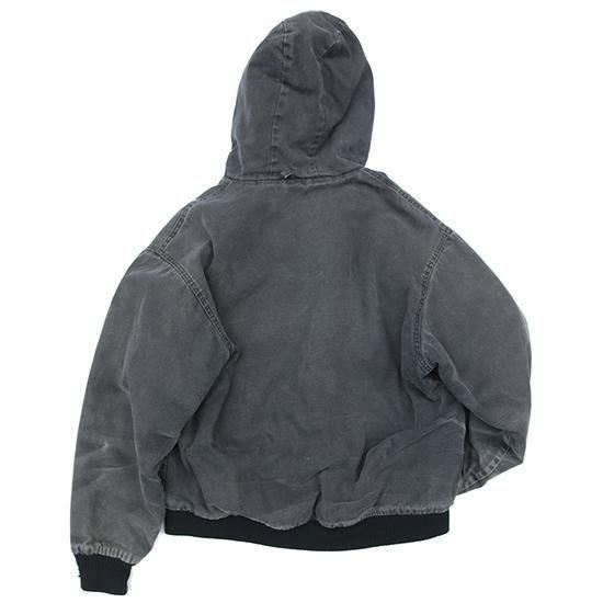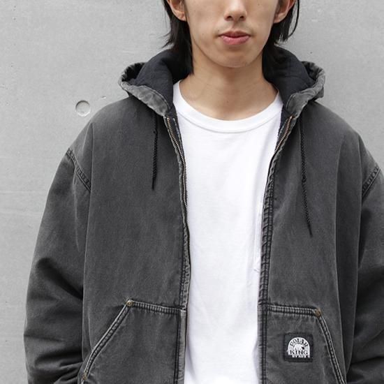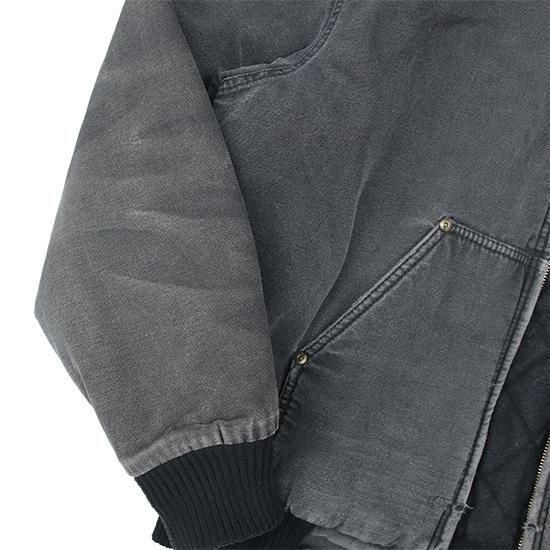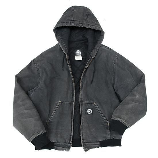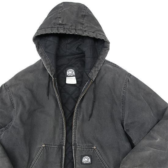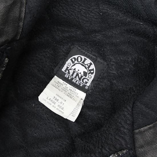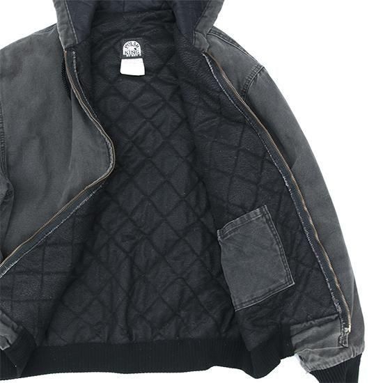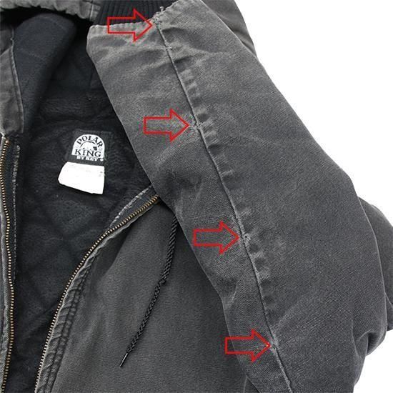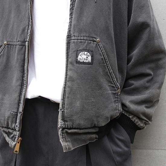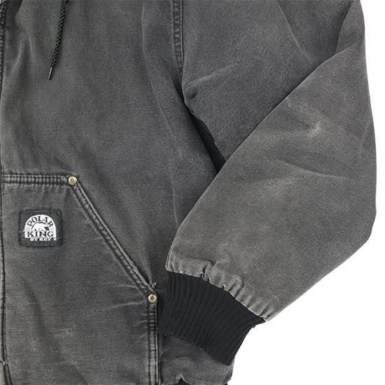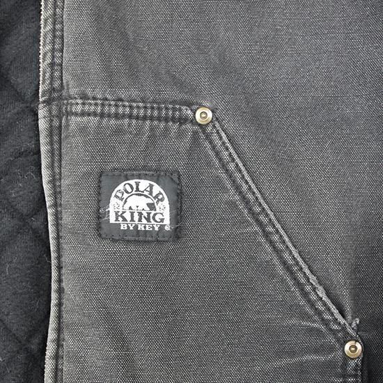 2000年代 ポーラーキング/キルトラインドアクティブジャケット ワークメーカー"Key/キー"のリフレッジ的極寒環境でのワークウエアラインであろう"ポーラーキング" カーハートでいう"アクティブジャケット"タイプ。 裏は保温性の高いマイクロフリース中綿キルティング。 広めの身幅、太めのアームx袖先、裾にリブで全体にまるっとしたシルエットが特徴。 着こまれて出た退色、アタリ、擦れのエイジングは古着ならではのリアルな表情で最高にかっこいい1枚。 表地:コットンダック 裏地:ポリエステル 中綿:ポリエステル 裏地キルティング、内ポケットx1 カラー:ブラック コンディション:ユーズド/全体に退色、擦れ、小穴あり 表記サイズ:L 胸囲 125cm/背丈 68cm/肩幅 53cm/袖丈 61cm 着用モデル身長:179cm その他のワークアイテムはこちらから
