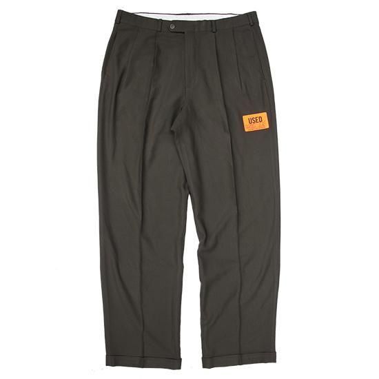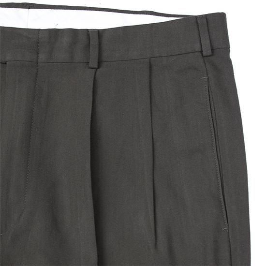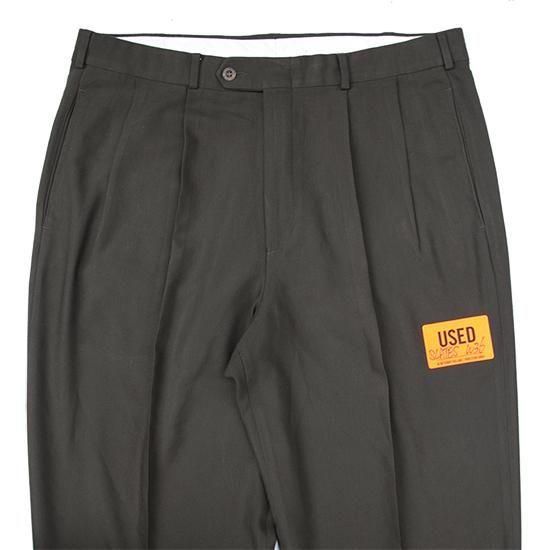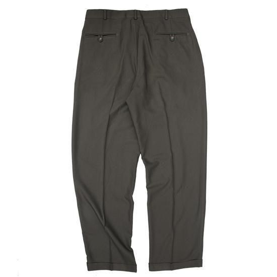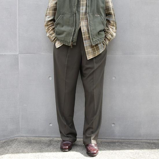 1999年製 スレイツ/2タックトラウザーズ アメリカ製 90-00年代頭までリーバイスが展開していた"Slates/スレイツ"(後にドッカーズレーベルに吸収合併)。 アクションスラックスがカジュアル&ビジネスに対しスレイツはドレス寄りでクラシックな仕様。 往年のアルマーニを思わせる深めのタックでドレープをきかせた、ゆったりとおおらかなフィットが特徴です。 時系列的にはスタプレ→アクションスラックス→スレイツ→ドッカーズと展開されていく流れで、スタプレ時代に培ったポリエステル使いがメインとなり、こちらはポリxレーヨンでレーヨン特有のトロっとしなやか、ドレープ感が強く出る生地を採用しています。 やっぱり嬉しいアメリカ製。 アメリカ製 素材:ダクロンマイクロファイバーポリエステル77%xレーヨン23% 2タックフロント(アウトタック)、裾ダブル カラー:ダークオリーブ コンディション:ユーズド/特に目立つダメージ無し 表記サイズ:W36xL32 実寸サイズ:W36xL31.5 ウエスト 92cm/股上 34cm/ワタリ 36cm/レングス 80cm/裾幅 22cm/総丈 111cm 着用モデル身長:179cm その他のトラウザーズはこちらから