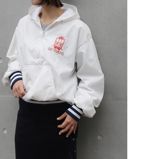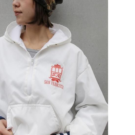 1990年代 アルテックス/ナイロンアノラック ヴィンテージのスヌーピーTなんかのボディとして使用されることもあるアルテックスは、ブランクウェアに定評のある老舗メーカー。ゆったりめの胸囲に対して短めの背丈&裾リブなので、野暮ったくならず着れる良いサイズ感っ 素材(表記無し) 表地:ナイロン 裏地:ポリエステル起毛 アメリカ製 ハーフジップ、フロントにカンガルーポケット カラー:ホワイト コンディション:ユーズド *フードのドローコード欠損、フード縁に薄い汚れ *左胸ロゴ下に薄いシミ *右脇付近に薄く色移りあり 表記サイズ:L (実寸Women's M-Lサイズ) 胸囲 124cm/背丈 60cm/肩幅 52cm/袖丈 61cm 着用モデル身長:156cm <その他のジャケットはこちら>