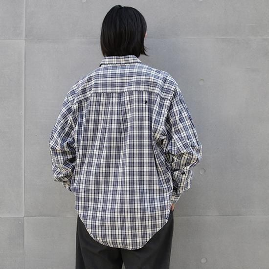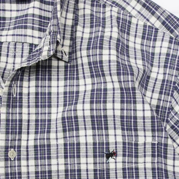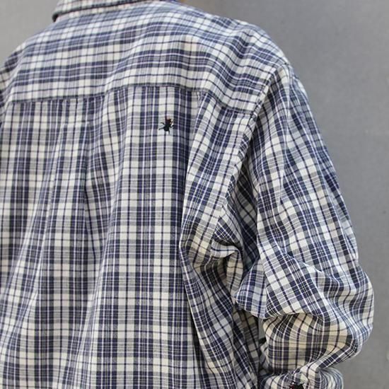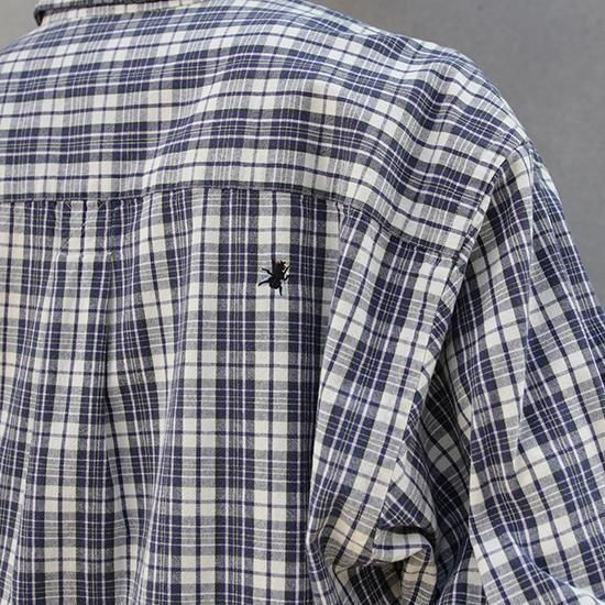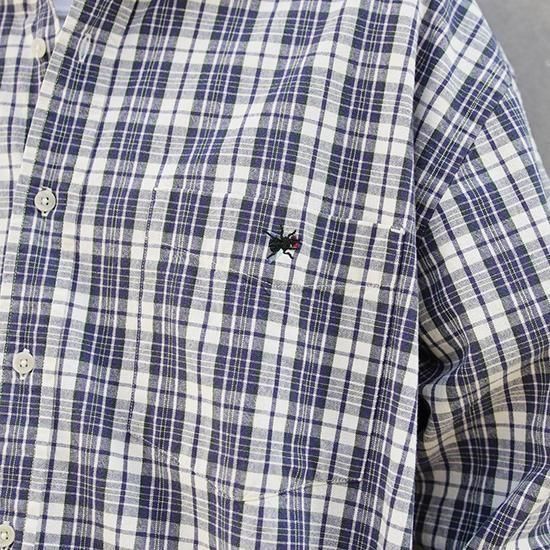 Aoi Industry for Props Store Annex "AP" 1990s- Eddie Bauer Heavy Twill Plaid SHirt 高いデザイン力と細部まで超精密な刺繍で表現する技術力で世界に知られる葵産業/Aoi Industoryとのコラボレーションコレクション。 アウトドア、アメリカントラッド、ワークウェアなど異なるジャンルから選び抜いたヴィンテージウェアに対し、腹側から見た蝿をそれぞれの個体に合わせて色、場所、個数を変えて刺繍しています。 1990年代初頭、白地のタグに切り替わったばかりの頃のエディーバウアーのシャツ。 コシのあるヘビーツイルを使用しています。 刺繍:胸ポケット x1、背中 x1、右肘x1 素材:コットンツイル カラー:ホワイトxブルー コンディション:ユーズド/使用感の少ないミントコンディション 表記サイズ:L 胸囲 136cm/背丈 82cm/肩幅 56cm/袖丈 64cm モデル身長 179cm 【AP Aoi Industry x Props Store Annexのコレクションはこちらから】