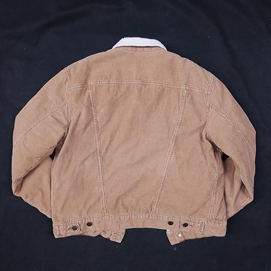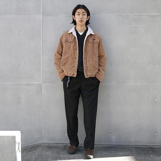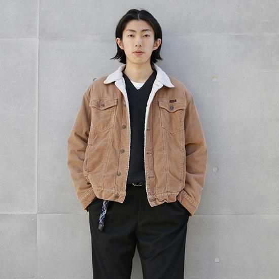 2020s- Wrangler/Sherpa Lined Corduroy Truckewr Jacket ラングラー/シェルパラインドコーデュロイトラッカージャケット 70年代ごろに登場した、襟と身頃の内側にボアを配した冬バージョンのトラッカージャケット。 カリフォルニアのサーファーにも愛されたシェルがデニムではなくコーデュロイのタイプで、秋冬らしいムードのある素材です。 ラングラーはリーバイスと比べて襟が小ぶりなことがポイントです。 ・襟、身頃内側にポリエステルボア、袖に中綿の入る保温性の高いアイテム ・リラックスしたボックスフィット ・ウエストポケット、裾にアジャスター 表地:コットン(コーデュロイ) 裏地:ポリエステルボア 袖裏、袖中綿:ポリエステル カラー:ライトブラウン コンディション:ユーズド/特に目立つダメージ無し 表記サイズ:M 胸囲 116cm/背丈 61cm/肩幅 51cm/袖丈 61cm 着用モデル身長:179cm その他のジャケットはこちらから