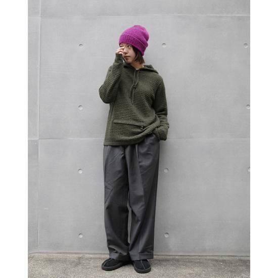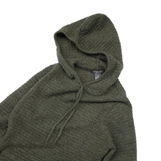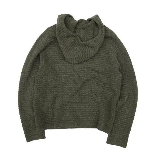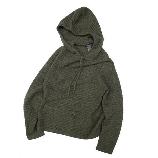 1990-00年代 Pandemonium/ウールニットフーディ ポコポコした表面の編みが可愛い、ウール素材のニットフーディ。ドレープ感の出るライトオンスで、アウターを羽織ってもモコモコしないのが嬉しいです。いつものスウェットをコレに変えるだけで1ランク大人な印象に。 素材:ウール100% ドローコード付きフード、フロント下部にジップポケット オーストラリア製 カラー:オリーブ コンディション:ユーズド 表記サイズ:Women's M 胸囲 104cm/背丈 58cm/肩幅 37cm/袖丈 61cm 着用モデル身長:156cm <その他のニットはこちら>