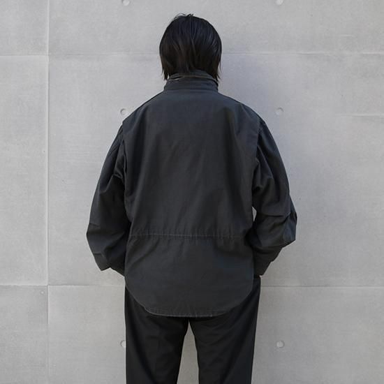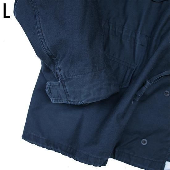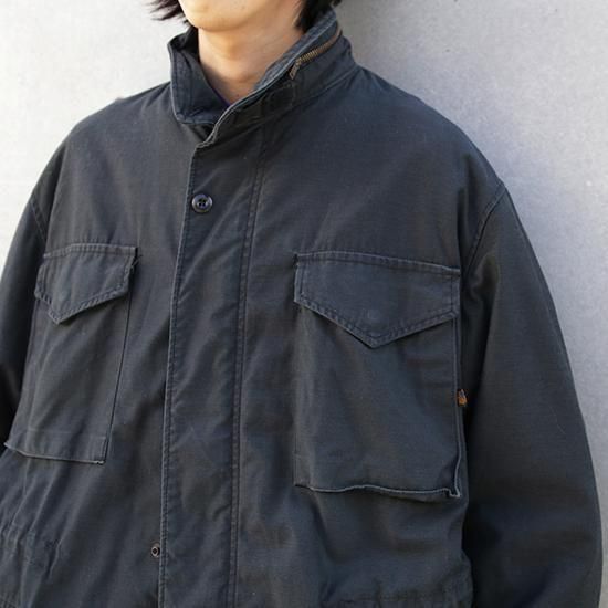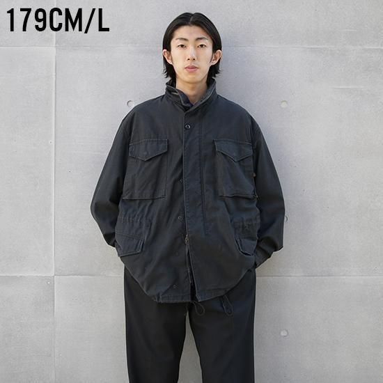 1990年代 アルファインダストリーズ/M65 フィールドジャケット "モデファイド エポレットレスカスタム" アメリカ軍でその汎用性の高さなどから最も長い期間採用され続けた名品M65、アルファが長く生産してきたモデルであり、大振りなフィットと太いアーム、ポケットの配置などが特徴で、民間向けの軍モノにはないカラーが魅力的。 どうしてもゴツく、硬い印象に見えちゃうエポレットをカスタム(カットだけでなくそれ自体を抜いてあります)を施し、肩周りの印象がスッキリさせ、ぐっと着こなしやすくなりました。 アメリカ製 素材:ナイロン50%xコットン50% サテン 裏地:ポリエステル65%xコットン35% 襟収納式フード、袖口ベルクロアジャスター カラー:ブラック コンディション:ユーズド/特に目立つダメージはありません。 表記サイズ:L-Regular 胸囲 132cm/背丈 77cm/肩幅 56cm/袖丈 60cm 着用モデル身長:179cm その他のミリタリーアイテムはこちらから